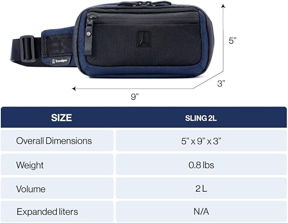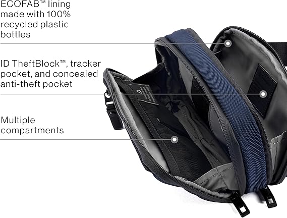 Light, sleek, and built for life on your terms, the Travelpro® Altitude™ Sling 2L is the ultimate, everyday, grab-and-go bag. Crossbody, over the shoulder, or around the waist, this versatile sling keeps your must-haves at hand. Look sharp and feel good about it with ECOFAB™ fabric, made from 100% recycled plastic bottles (Approx. 4 bottles). The rugged, high-density ballistic ECOFAB™ exterior with DuraGuard® coating shrugs off scrapes and stains, while the ECOFAB™ interior lining with H2O guard easily wipes clean. Plus, ultra-strong, water-resistant YKK® zippers glide smoothly and hold up to daily use. Stash your stuff in multiple compartments designed to keep everything organized and easy to find, with a quick-access front pocket and a built-in key leash for those can’t-lose items. A Travelpro® ID TheftBlock™ pocket for your cards and a dedicated pocket for your tracking device keep security on point.